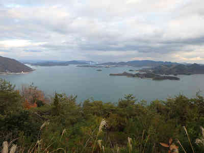 山頂にはアンテナと展望台が建ち、手前の花壇のような所の中央に三角点が置かれていた。展望台からは眼下に佐木島、因島などの展望が広がりいつまで眺めていても見飽きることはない。しばらく展望を眺めた後、下山を開始した。