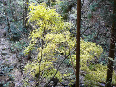 この先は木の間越しの展望もなくなるが、周囲には美しい樹林が広がっているので、この景色も素晴らしい。急な斜面につけられた緩やかなジグザグ道を下りて行くと、道の側に大きなブナの木が立っている。これが樹齢300年とも言われる大ブナの木だ。しばらく大きなブナの木を観賞した後更に下りて行くと、谷の中に入る事になり、再び紅葉の美しい自然林の中に入る事になった。