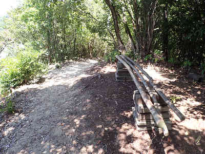 建物の駐車場横を進み山道に入る。ワイルドな登山道を少し進むとブロックの上に木を渡したベンチがあり、ここからは広島市街を見晴らすことができた。展望地で小休止の後、坂へ向かう。真夏なのでとにかく暑いし汗が噴き出る。