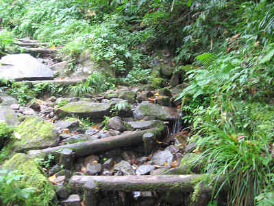 足下の石畳がとても印象的でこの道が昔からの信仰の道であることが判った。交通手段の乏しい時代に、この道を歩いて遠く伊勢までお参りをしていたのだ。自分が信仰の道を歩いていることがとても嬉しくなる。 信仰の道を少し進むと右手に氷ノ越まで0.8kmと標高1000mの標識を過ごし、その先では横木の階段道の側を沢が流れており、この付近はお花畑のように沢山の花が咲いている。冷たい沢の水を飲み、顔を洗い少し休憩を取る。