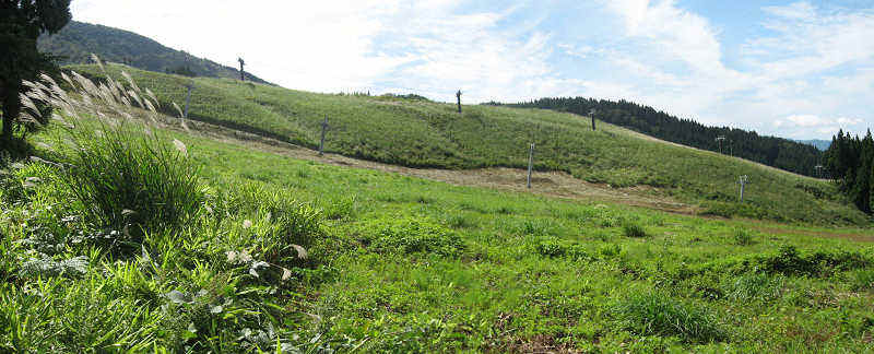 草原のスキー場に到着 この先舗装道をゆっくりと下りて行き、分岐を右に取ればキャンプ所への近道となるが、スキー場下の石が気になっていたのでそのまま氷ノ山三の丸コースの登山道方面に向かって下りて行くことにした。三の丸コースの横を通り過ぎ、広い舗装道の手前の標識を確認すると、氷ノ越登山道まで2.5kmを歩くことになる。