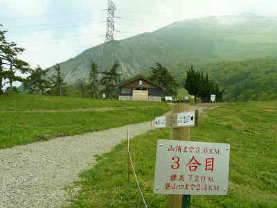 緩やかな登山道を少しずつ進むと、左には伊吹高原ホテルなどが建っている。まもなく3合目に到着、山頂まで3.6km、標高720m地点で、登山口からは2.4kmの距離である。この地点から山頂までは90分、登山口へ60分と案内されている。緩やかな傾斜の道を進むとやがて三合目公衆便所へ到着、これより先に公衆便所はないそうだ。