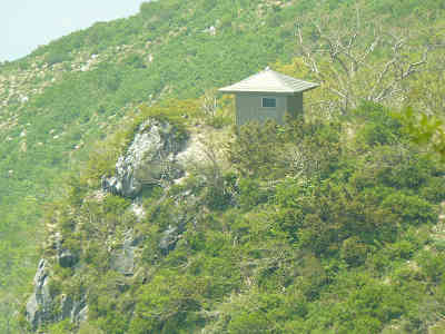 遠くに見えていた避難小屋が少しずつ近づいている。足下に黄色の花を眺め、眼下に広がる展望を楽しむ。このあたりで足下に転がっている白い石や岩は石灰岩であることが分かった。やがて避難小屋の横を通過、これから先は避難小屋を上から見下ろすことになる。避難小屋越しに眺める3合目付近の草原も良いものである。
