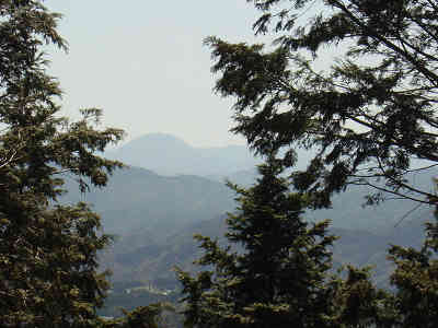 左右の木々の間隔が段々狭くなると共に坂の傾斜も緩くなり、木の間越しに須佐の高山が見え始めた。急傾斜の登り始めからから15分程度で歩きやすい道になり、犬鳴山山頂に到着した。