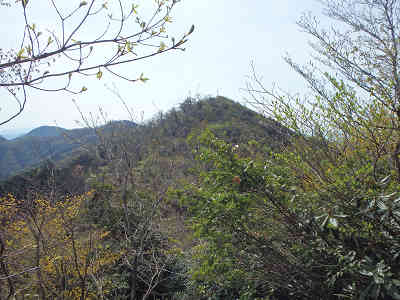 二ノ岳の展望地から眺める風景 花崗岩質の岩場を下り、「C−3」地点を通過するが周囲のシャクナゲはやはりつぼみのままである。緩やかに坂を下れば鞍部の大竿峠へ到着、右に下れば登山口へ戻ることができる「C−6」地点でもある。ここでは展望を求めてもう少し西へ足を延ばし、一の岳へ向かうことにする。