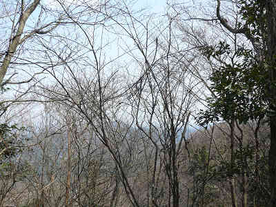 木々の葉が落ちているのでとても明るい登山道だが、遠くまでの展望を得ることはできない。もう少し進むと再び頂上まで600mの標識を過ごす。この地点が中間点となるようだ。ここまで来ると、眼下には木の間越しながら日本海までを見晴らすことができる。