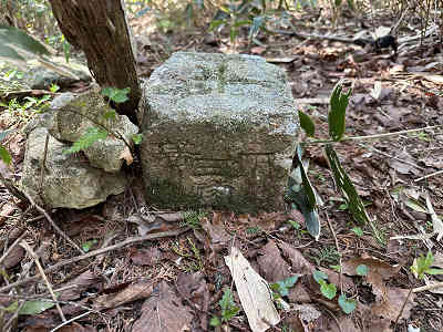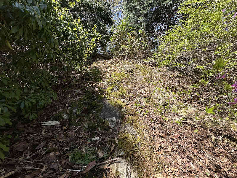 歩き始めは舗装道で、平坦な道でもあるため歩くスピードは少し早めになります。コンクリートの橋を渡れば、この先で数軒の家や廃屋を過ごします。庭の状況から草が刈られているところもあり、別荘的に使用されているのかも知れません。植林の先に立派な石垣が残っており、かつての生活の跡を見つけることができました。