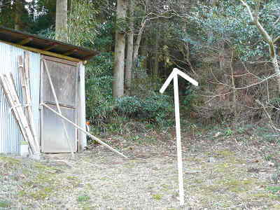 上の段へ着くと梅の木があるので、左方向に見える作業小屋へ向かう。この作業小屋の右から奥へ続く道が石ヶ山の登山道である。自然林の下には踏み跡が続いており、途中に倒木のある場所を迂回しながら進む。