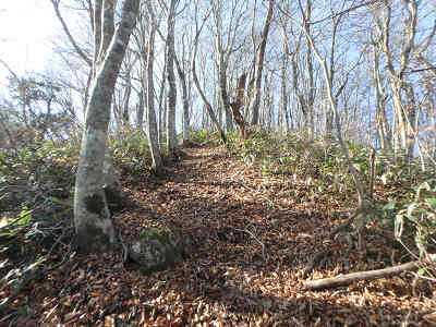 すぐに周囲の自然林が消え、植林帯の急登に変わる。急登をしばらく辛抱していると、進行方向左側が明るくなり、自然林が戻ってきた。青空の下に輝く紅葉はわずかでも美しい。やがて周囲が広葉樹に変われば気持ちの良い落葉の登山道、なんとも素晴らしい道が続く。