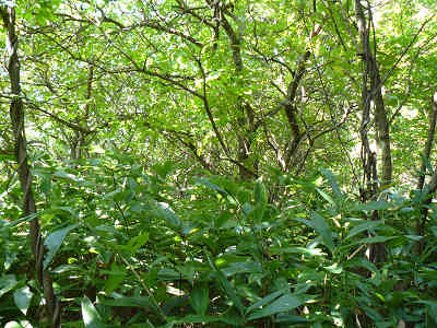 しばらく辛抱して笹藪を進んでいたのだが、とても難渋する道なのでN先生の先導により直接尾根を目指すことになり、左手の斜面に取り付く。急な斜面を一登りすれば尾根に着いたのだが、ここでもツルのはびこる笹藪が続く。再び笹藪を難渋しながらかき分けて進むと突然歩きやすい尾根道に着いた。これでようやく安心して進むことが出来そうだ。