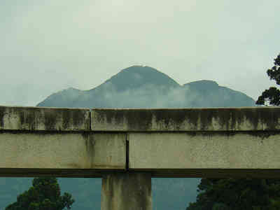 午前6時半に岩木山神社へ到着、早速神社へ参拝する。入口の大鳥居越しに眺める岩木山は山の形をしている。ただし、心配なのは山頂付近に少しずつ雲がかかり始めている事である。1628年建立の朱の楼門を潜り、中門の前に出る。時間が早いせいか、北門鎮守の額の掛けられた中門は固く閉ざされていた。