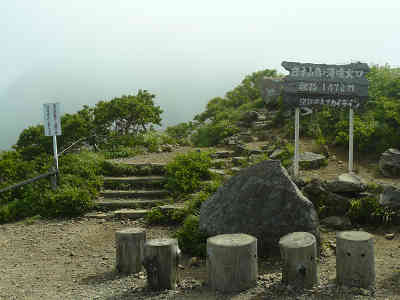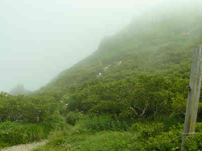 更に続く急登 そのまま道なりに進み、山頂へ向かう最後の坂へ取りかかる。すぐに長平登山道の分岐を過ごし、ごつごつした岩場を登る。足下が不安定なので、慎重に足場を選ばないと身体がふらついてしまう。雲の舞う登山道なので自分の居る位置はさっぱり分からないが、とにかく上へ上へと高度を上げる。