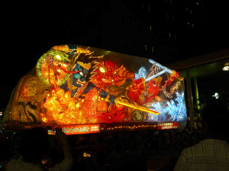 青森ねぶた祭り 青森ねぶた祭りの風景 夕食の後はいよいよねぶた祭り観光。青森市の中心街で幅の広いねぶたを見学。午後7時から9時までたっぷり2時間の演技だったが、時間があっという間に過ぎるほどの豪快なお祭りだった。お祭りの途中で雨も降り始めたが、立っている場所がアーケードの下だったので大して濡れることはなかった。昨年は山形花笠まつりを見学したので、東北四大祭りの二つを見学し終わったことになる。