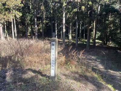 大峰を出発し分岐を左折する。この分岐には東水門へ540mの案内が立ち、20丁の丁塚と二十丁目地蔵尊が祀られていた。分岐から東へわずかに進むと左に若宮社を過ごし、更に進むと物部神社と五十猛神社が祀られていた。3つ目の山頂に向かうには、この両社の間に続く道を北に下る。