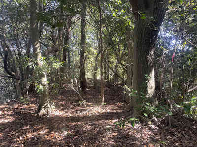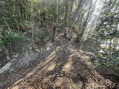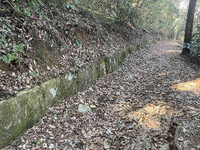 鋪装道まで引き返し、次は南水門を見学する。そのまま鋪装道を下り、カーブミラーの手前を右折、この入口には「神護石南水門約70m」と案内されている。入口から南へ進み、すぐ左に続く坂を下ると石が転がっていた。この場所が南水門である。