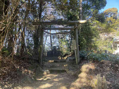 すぐに周囲を竹林が覆い、倒竹を避けながら高度を上げる。進路が少し右を向けば植林の下を進み、再び竹林の中を進むことになる。山腹に続く道を辿り頭上が開けてくれば、前方に石城山が見えてくる。左の小山にはヤマザクラなどが植えられているようだ。すぐに三鍛冶屋登山口からの道が右側から合流し、分岐の左側には祠が祀られていたので参拝する。