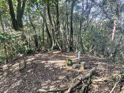 坂を下り北水門に到着、足下はぬかるんでいた。北水門の石組み等を眺めて出発、すぐに西水門に着き、これで東西南北の水門を眺めることができた。西水門を過ごして少し坂を登れば広く平坦な場所に出る。この場所から南東に続く坂に取り付けば、四等三角点の置かれた月の峰(築山)に着いた。これて石城山5峰の全てに立つことができた。