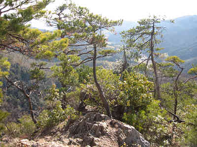 階段を折り返すともう十八丁、この付近から岩国方面を振り返ると松の木の間越しの展望が美しい。周囲の赤松の美しいさに感動しながら進むと最後の十九丁を通過、これで途中の丁塚は全て数えることが出来た。いよいよ弥山道の最終地点の弥山社が近くなってきた。