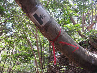 柏木山への道はよく踏まれており、目印のテープも分かり易く道を間違えることはない。緩やかな道を25分歩くと最後の急坂となり、10分程度急な坂をあえぎながら登ると右への分岐の道を取り、林を抜けると柏木山山頂に到着した。弥山の日宛神社からは40分の行程だった。