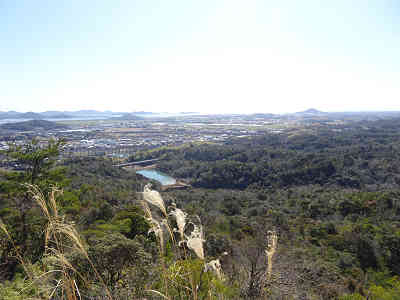 広い岩上に立てば足下に地籍図根三角点の標識が打ち込まれていた。岩上からは絶景が広がり、左に大海山、右へ向かって相原山、経納山、藤尾山の先に兜山、きららドームの横に日ノ山、更に宇部市の霜降岳まで眺めることができた。全体的には霞みがちの展望だが素晴らしい展望に満足である。