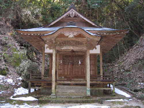 宮利神社に参拝 宮利神社から少し引き返して登山道に戻る。登山道は少し掘れており、川底を歩くように進んで行く。ほとんど一本調子の坂が続いており、歩く速度も遅くなる。背後には雲霞山・熊ヶ山、南西方面には蓮華山をそれぞれ木の間越しに見ながら高度を上げて行く。