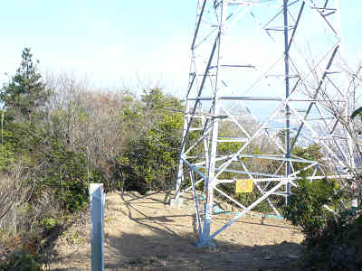 大竹方面の展望 そのまま分岐を直進すると鉄塔の建つ展望地に到着、この鉄塔下からの展望こそが岩国山登山のハイライト。北に傘山、経小屋山、極楽寺山、海を挟んで宮島弥山、その手前に和木町の鉢ヶ峰と素晴らしい展望が開けている。また、鉄塔前の樹林を挟んで南東側には岩国市街と岩国基地、更にその先には美しい瀬戸内海と海に浮かぶ周防大島が続いている。