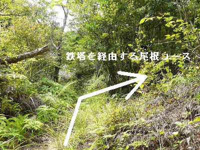 古い鉄塔の基礎部を過ごし、斜面をジグザグに下る。やがて14番鉄塔を通過、15番鉄塔への分岐が右へ現れるが、かまわず直進する。再び古い鉄塔の基礎部を過ごし、坂を下れば、周囲にシダが目立ち始める。少し頭上が開ける付近から背後を振り返れば、先ほど通過した14番鉄塔を振り返ることができる。