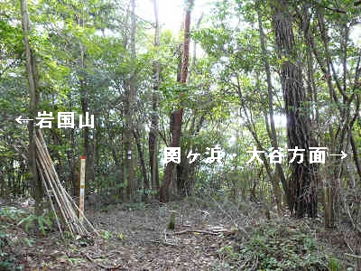 展望地から少し戻り、北の桜ヶ峠へ戻る縦走路へ入る。左右にシダの茂る道を下ると、右へ続く巡視路を見るが、かまわず真っ直ぐ進む。この先で竹の目立つ鞍部へ下り、右方向へ回り込む。
