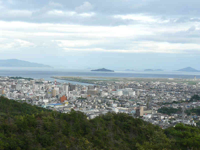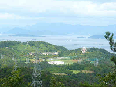 眼下に広がる岩国の展望 ほんの少し尾根を進むと鉄塔の建つ広場に着き、南に岩国市街とその先には米軍岩国基地などの展望が美しい。桜ヶ峠からほんのわずかの場所で得られる大展望にとても感激する。鉄塔の奥に続く尾根道はよく踏まれており、真夏でも快適な登山道である。