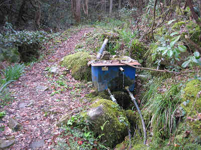 間もなく「たいのすけ鈩跡地」に到着、この20m先には冠山の名水があり、冠山山頂までは1.3km50分と書いてある。冠山の名水は帰りに汲んで帰ることにしてまずは冠山に向かって進んで行く。