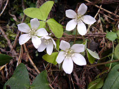 冠山の名水でのどを潤し更に下山を続ける。この先は杉の植林帯の中に入り、一気に高度を下げて行き、途中ではかわいい花を観賞、沢をいくつか越えて鉄塔の見える地点まで戻る。この付近で足下にピンクの不思議な花を見る。花図鑑で調べてみるとショウジョウバカマだ。こんな綺麗な花を登山時に見落としていたようだ。