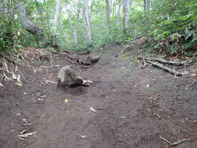 右側に補助のロープの渡された道が始まり、足下は粘土質の滑りやすい道が続いている。坂の傾斜はたいしたことはなく、のんびり対岸の尾根を眺めながら坂を下る。途中には桶の淵と案内される桶のまわりを絞めたような地形の場所を過ごす。少し下れば登山口まで1.3kmの0.5合目へ到着、もう登山口まで来た道を引き返すだけである。そのまま木の根の多い道を下り、登山口へ到着。最初は大変な道間違いをしたが、無事に岩手山の登山を終了した。