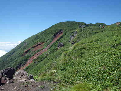 この付近は標高1770m、もう山頂は目の前で残りは1.7kmである。8合目避難小屋を出発し、西へ向かう。山頂方面はとても晴れており、展望が期待できそうだと思っていたら、少しずつ雲が増えているので少し不安。それでも足下にはお花畑が続いているので、花を観賞しながらのんびり進む。