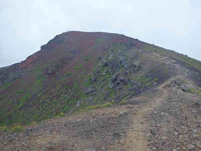 やがて不動平へ着き、進路を北へ採る。もう山頂までは1.2km、岩のごろごろした道に入る。足下は火山性の滑りやすい小石をちりばめた状態で、ロールベアリングのようにとても滑りやすい。慎重に高度を上げていると、間もなく左右の分岐へ着く。ここでは少しでも歩きやすいと言うことで、右道を採る。