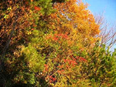 下山口にはテープが巻かれていた 林道から眺める夕陽を浴びた紅葉 午前9時半に登山を開始して午後4時半に配置した車に着くまで約7時間、しっかりと一日遊ぶことが出来た。登山口にて解散し、Iさんと一緒に法師崎農園に行くと今年は青いミカンが目立っており、例年に比べると少しミカンの完熟は遅い気がした。でも赤みかんは大豊作、ネーブルも実は小さいが沢山実をつけており、文旦も沢山実っていた。