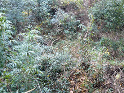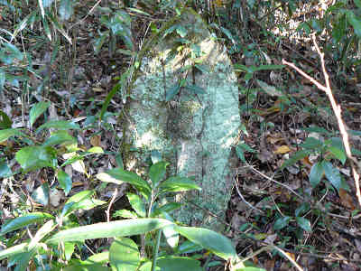 今回は熟練者の指導のもと、慎重に下山を続ける。ヤブ道を歩きなれた人ならば、踏み跡を確認し、テープに従って下りて行けるのだが、今回は初心者も含まれており、特に時間をかけて慎重に下山する。途中2ヶ所道案内のお地蔵様を確認。この道が昔の参道であることは間違いない。