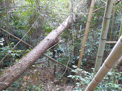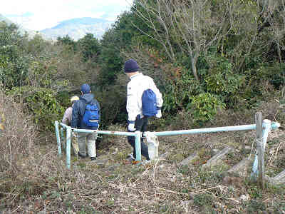 滑り易い岩の続く道に入り、中島先生は目印のテープを巻く作業に忙しい。左右にアオキの茂る登山道は急登で滑り易く、ゆっくり高度を上げる。間もなく登山道は左(北)方向に向き、植林帯の中を進んで行けば、登山道は右(東)へ向き、はっきりした踏み跡の残る道を登る。