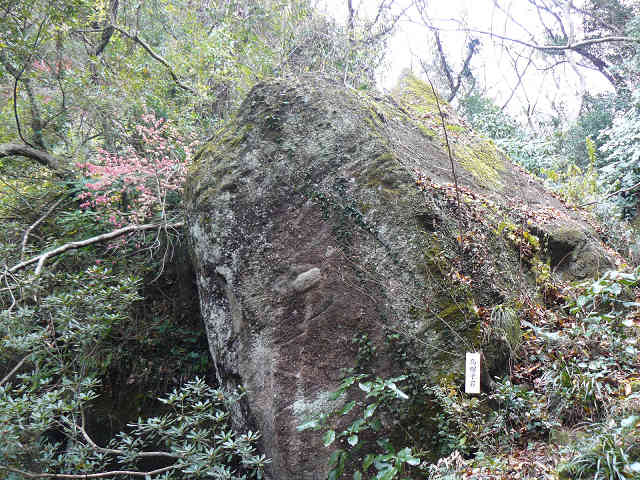 烏帽子岩の先で道は分岐し、左手には保慶の七不思議を訪ねる道が続いている。よこしまな心の持ち主は挟まれると伝えられる「せり岩」、四季を通じて快適な風が吹き出る「風穴」、昔湯が出ていたが、後に道後へ移ったと伝えられる「湯の段」と続く。こちらの散策は後日のお楽しみとする。本日はこの分岐を右に採り、保慶の岩屋観音へ向かう。標識には岩屋観音まで1.4kmと掲示されている。