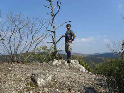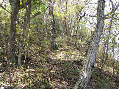 大迫山の山頂風景 大迫山からの展望は木の間越しであり、すっきりした展望とは言い難いが、祠跡に出会えたことで満足の山旅である。大迫山を出発、峠を経由し、登山口の芸術村までのんびり引き返した。