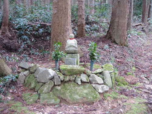民家の横を抜けると林に向かう 民家を通り過ぎてその先の分岐を右・左・右・左と道なりに進むと檜の植林帯に入る。すぐにお地蔵様を見るので早速お参りをし、その先右手の墓を過ごした奥に岩屋山観音堂が立っている。観音堂の横にはこの観音堂の説明板が立っており、説明板には次のことが書かれている。