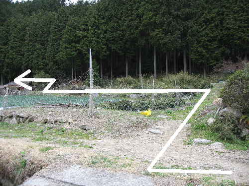 柿木原橋を渡り正面の民家の横を通る 右手にお堂とバス停・カーブミラーを見て、反対側西方向に向かって柿木原集落に向かう道に入る。渋川に掛かる柿木原橋を渡ると正面に鉄工所を見る。鉄工所には小さな犬が繋がれていたがこの犬はおとなしい犬で吠えることはなかった。道は左にカーブし民家の横を通り過ぎると、この民家には二匹の犬がおり、一斉に吠え始めた。