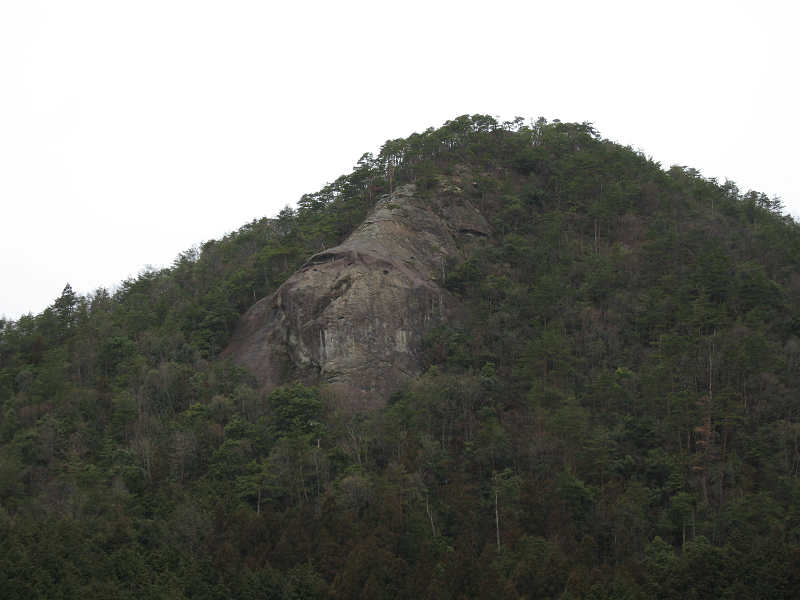 県道から見る岩屋山 ライオン? よく見てみるとライオンのように見えるのでライオン岩とも呼ばれているそうだ。登山口は烏帽子岳と同様柿木原集落であるが、集落付近には適当な駐車場所が無く、通行の邪魔にならないように少し鹿野方面に戻った坂の途中の山側に広い駐車スペースがあるので車を置き、柿木原集落に向かって下りて行く。
