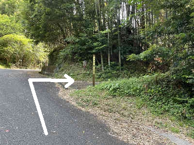 御山神社を出発し、東へ続く鋪装道を辿り丁字路を左折、すぐに阿武町により設置された「神宮山」の案内と「奥宮→」の案内に従い分岐を右折する。竹林などを眺めながら鋪装道を進むと進路は左上に続き、この起点にも奥宮の案内が置かれていた。