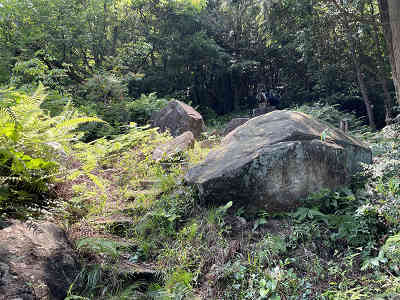 やがて800段を過ごせば文政年間の石鳥居に出会い、鳥居を潜れば左右に灯篭が置かれていた。灯篭の先で千段を過ごし、急登の階段を登る。1200段から1300段になると周囲にワイルドな岩場が現れ奥宮が近いことを感じる。