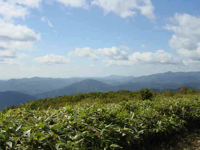 左右に笹藪を見ながら坂を登り、来た方向を振り返ると女鹿平山が笹藪の向こうに広がっている。遠くにある山頂方面を眺めると十字架のようなものが見える。