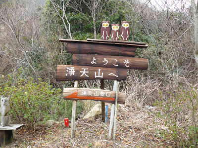 すぐに道路を遮断する鉄柵が現れるが、横を抜ければそのまま奥へ進むことができる。この先未舗装道が続くけれど、別に何の問題もなく、あの鉄柵さえなければそのまま車で進入できるのに・・・、等と思いながら緩やかな傾斜の坂を進む。間もなく林道が左に分岐する箇所で、立派な浄天山登山口の標識が現れた。