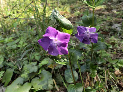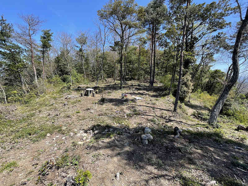 コンクリートの橋を渡ると周囲には春の花が咲いており、まさに春爛漫の中の登山である。わずかな坂を登れば右に平坦な広場があり、盛りを過ぎて葉の目立つ桜を眺めることができた。これも春の風景である。