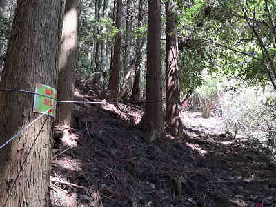 竹林を抜ければ植林の下を進むことになり、城平山登山道の案内が設置されていた。この案内は要所に配置されているため、道に迷う心配は無い。左に歴史ある石組みを眺め道なりに進むと目の前に竹林が現れ、足下は滑りやすいガレ場に変わる。慎重に足下を確認しながら高度を上げれば再び案内板が置かれていた。