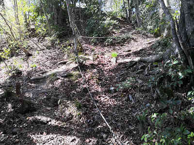 さて、光明寺の敷地前で折り返すように左折し、少し進めば急登に取り付くことになる。補助のロープの渡された道が続き、一気に高度が上がる。すぐに311mの標高点との鞍部に着くが、311mは光明寺の敷地内なので立入禁止となっていた。