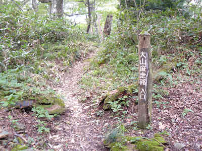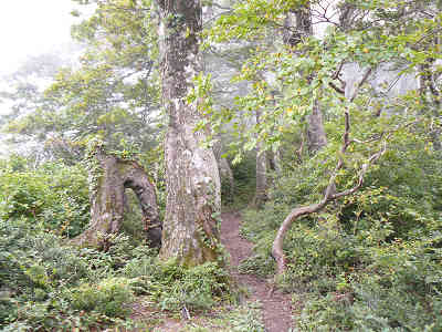 船上神社を出発し、大山縦走路に入る 縦走路に入ると、左右に笹原とブナ林を眺めながら快適な散歩道を進んで行くことになり、左手に船上山国有林の標識を過ごし、緑のシャワーを体全体に感じながら進んで行く。周囲に展望を得ることは出来ないのだが美しい樹林を眺めていれば疲れも吹き飛んでしまうし、足下に咲く美しい花、木の間越しの展望、周囲を観察しながらの山歩きは時間さえも忘れてしまいそうだ。